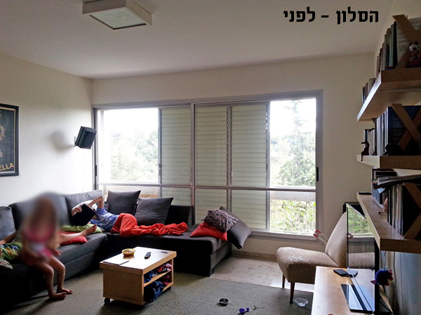 משיקולי תקציב הוחלט שמערכת הישיבה בסלון לא תוחלף. למעט כריות נוי ושטיח שנרכש יד שניה – לא נרכש איבזור נוסף. שולחנות הקפה התכולים הותאמו לגוון הכחול בשטיח. נקודות החשמל הוזזו בהתאם לגבהי המדפים בספריה, וגופי תאורה בשפה עיצובית משלימה מחליפים את גופי התאורה הישנים.