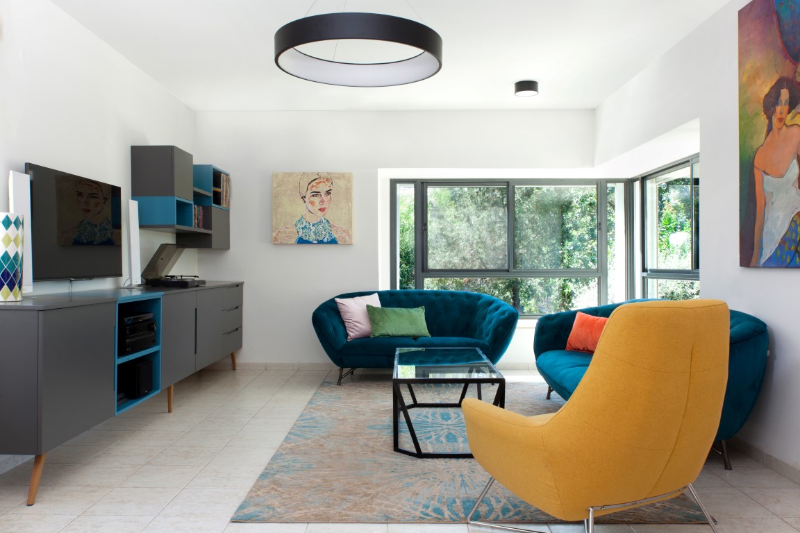 הוחלט על שינוי מקצה לקצה. חלונות העץ הוחלפו בחלונות אלומיניום גדולים שמכניסים את הנוף הירוק פנימה; הקירות נצבעו בגוון לבן-אפרפר; מערכת ישיבה חדשה וצבעונית נרכשה לסלון ועבודות נגרות הותאמו לצרכי האחסון של תקליטים, ספרים, דיסקים ומכשירי מדיה.