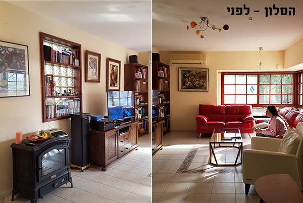 כפי שניכר בתמונות ה"לפני" – הסלון היה מעוצב ומרוהט בגוונים כהים, לרבות חלונות עץ בגוון מהגוני. הקירות היו צבועים בגוון שמנת כהה וספות העור האדומות יחד עם הרהיטים עמוסי הספרים והתקליטים – הוסיפו תחושת "כבדות" לחלל. בעלי הבית חשקו בעיצוב מחודש, מודרני ומואר יותר לחלל הזה, שלמרות ריבוי החלונות בו – היה יחסית חשוך בגלל הגוונים הכהים.